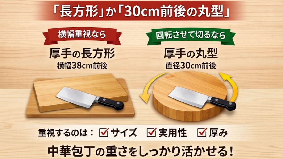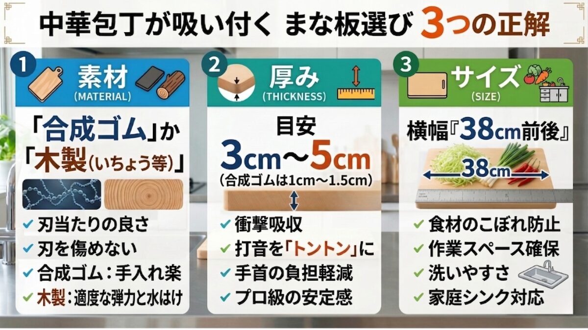 中華包丁のポテンシャルを120%引き出すには、重い刃を優しく受け止める「素材」と「厚み」、そして家庭での「扱いやすさ」が重要です。