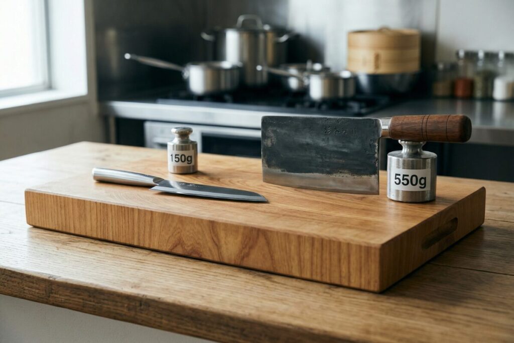 中華包丁は、普段使っている三徳包丁とは重さも使い方もまったく違います。まずは数字で、その違いを見ていきましょう。