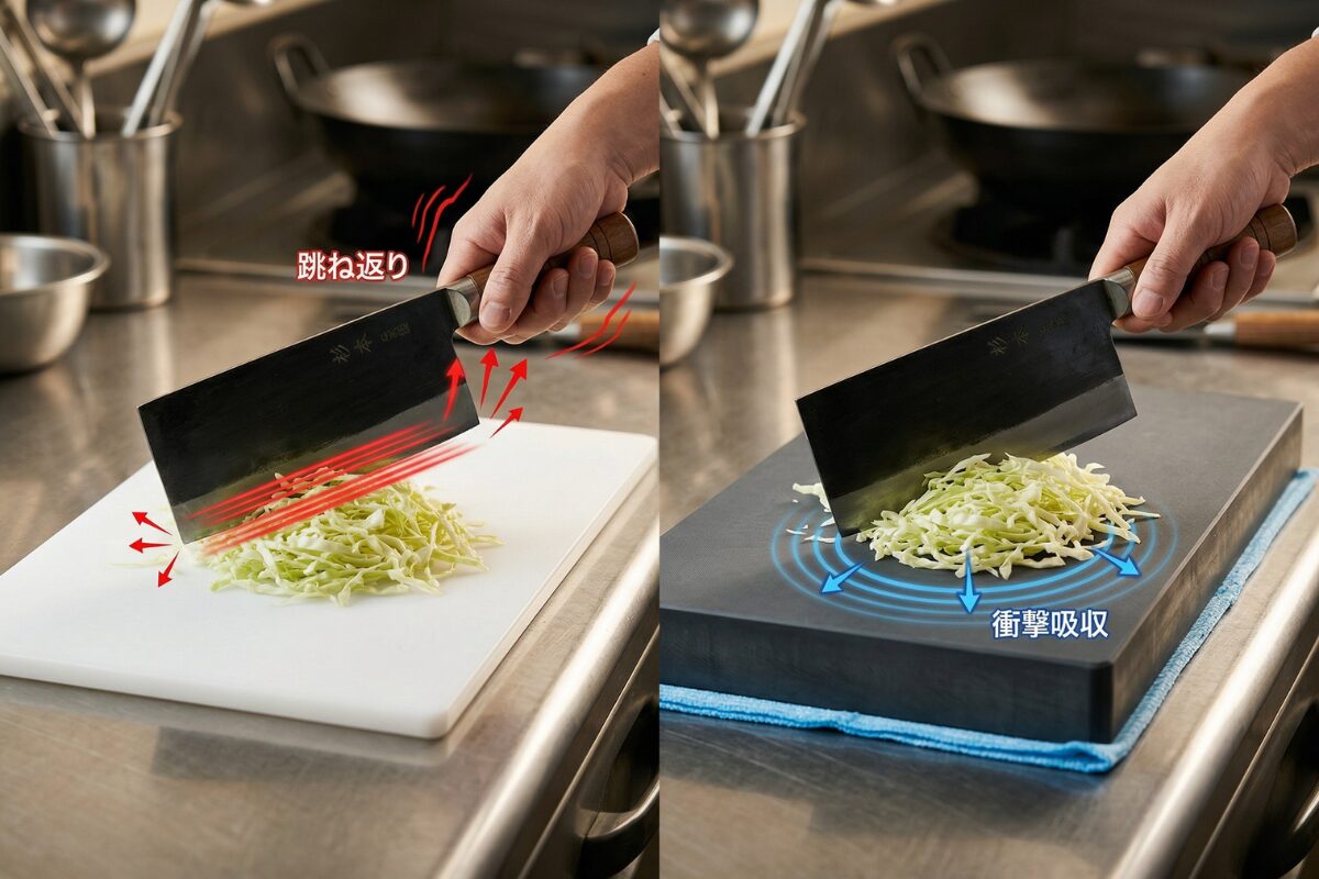 薄くて硬いまな板で中華包丁を使うと、衝撃が内部で吸収されず、そのまま上へ返ってきます。これが跳ね返りです。