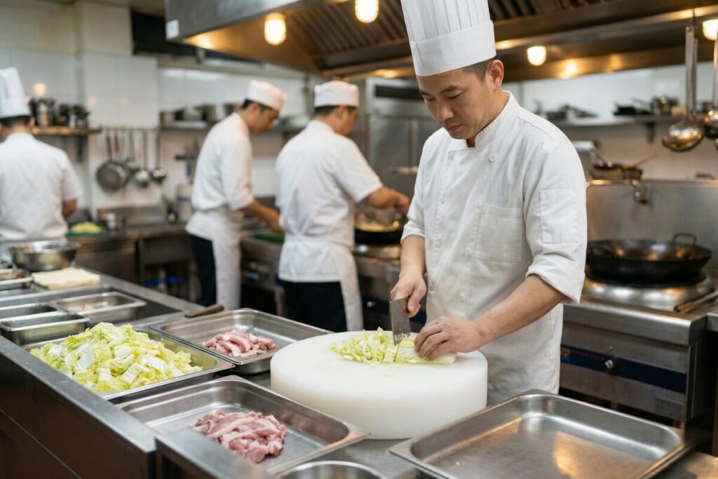 中華料理では、キャベツ半玉や大量の長ネギなど、大きな食材を連続して切る場面が多いです。