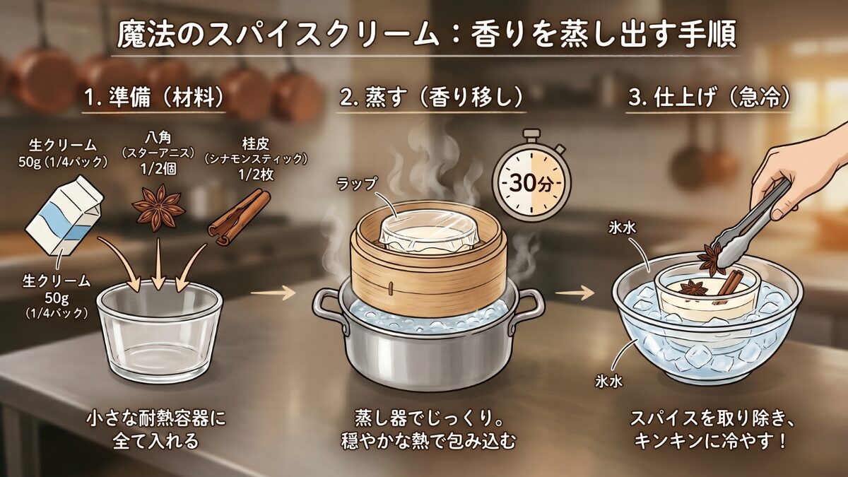直接火に当てず、蒸気の穏やかな熱で包み込むように加熱することで、スパイスのキツさを抜き、「上品で奥深い香り」だけをクリームに優しく移すことができるのです。