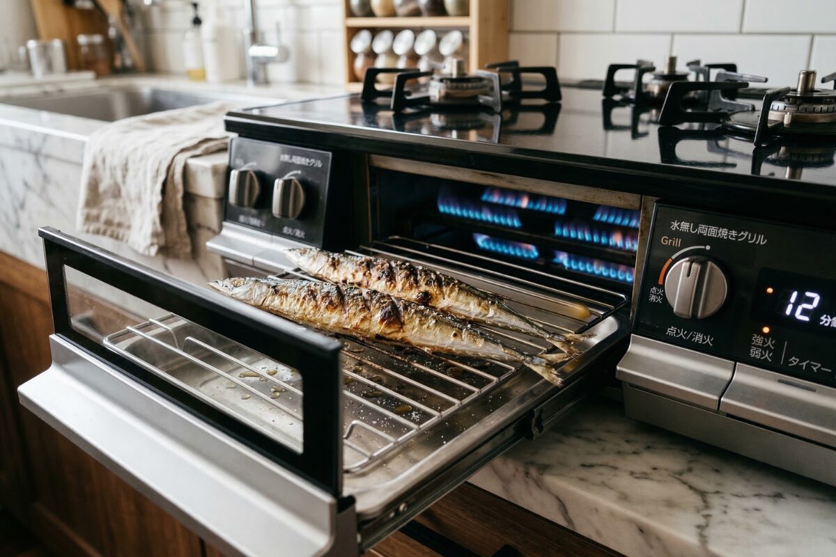 魚焼きグリルをあえて排除し、その分を火力と清掃性に全振りした潔い設計。ステンレスの無骨なボディと重厚な鋳物五徳は、まさに「料理好きのための道具」です。